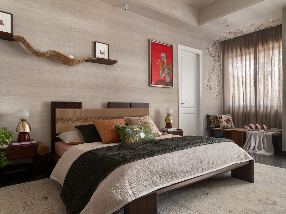 The rooms are not uniform. One bedroom is calm, with pared-back walls and muted textiles. Another is layered, with tactile surfaces and deeper tones. Yet the house reads as a coherent whole. Aneja said she was careful to ensure that cohesion came from sensibility rather than trend. She avoided theme-based styling that would date quickly. In the dining space, tableware from multiple studios is set as though guests are expected. The chairs are placed at practical distances. The lighting is low enough to suggest evening use.